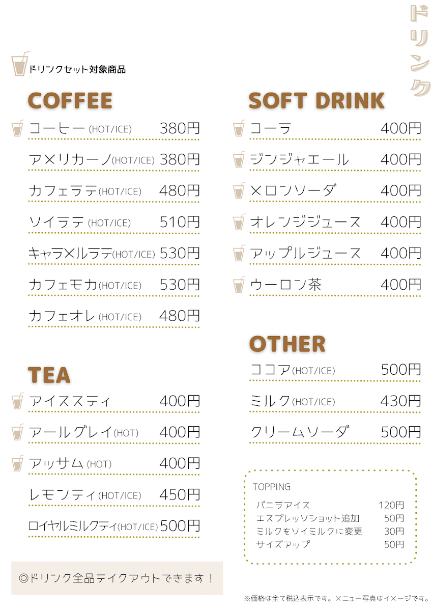 - DRINKS: Choose from a variety of hot and iced coffee, refreshing lemon tea at JP¥500, or an ice-cold oolong tea for ¥420. Drink sets are available at a great value.